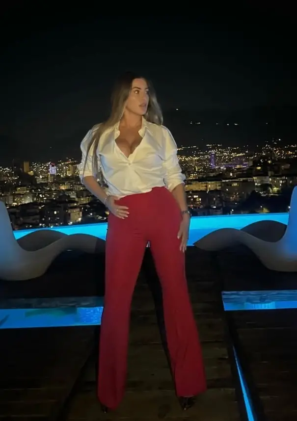 Ajo ka zgjedhur një këmishë të bardhë dhe pantallona të kuq me bel të lartë, duke krijuar një pamje që reflekton energji të fortë dhe stil të rafinuar.