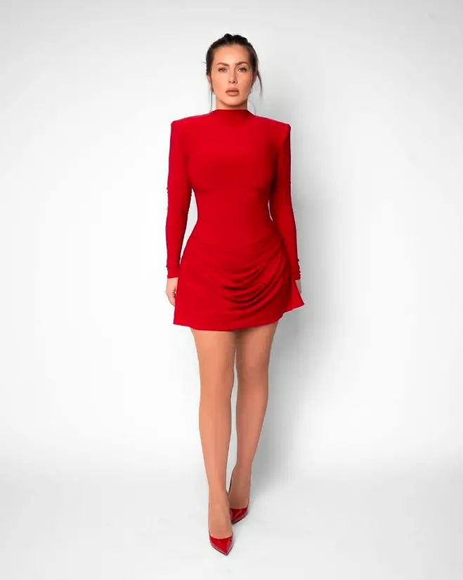 Olta shfaqet në një fustan të kuq, të ngushtë, që thekson format e saj trupore, duke e bërë atë të duket më joshëse se kurrë më parë.