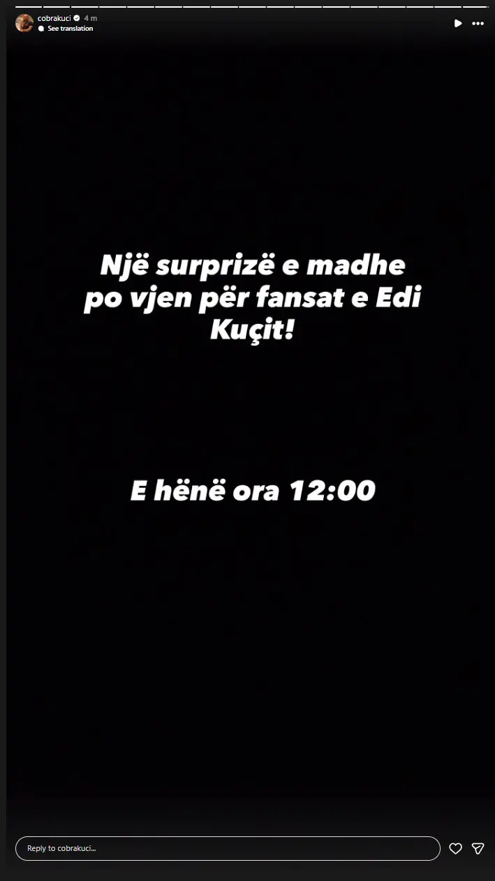 Njoftimi thotë se “Një surprizë e madhe po vjen për fansat e Edi Kuçit! E hënë ora 12:00”.