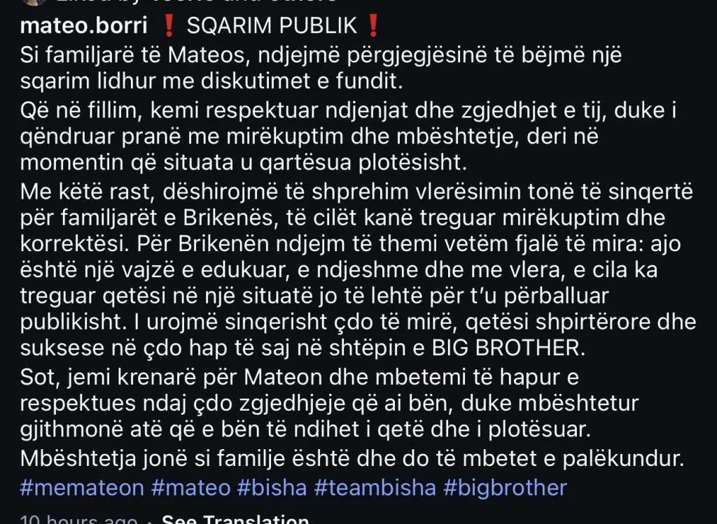 Familja e Mateos ka reaguar me forcë pas ngjarjeve të fundit në “Big Brother”, duke shprehur mbështetje të plotë për banorin e saj.