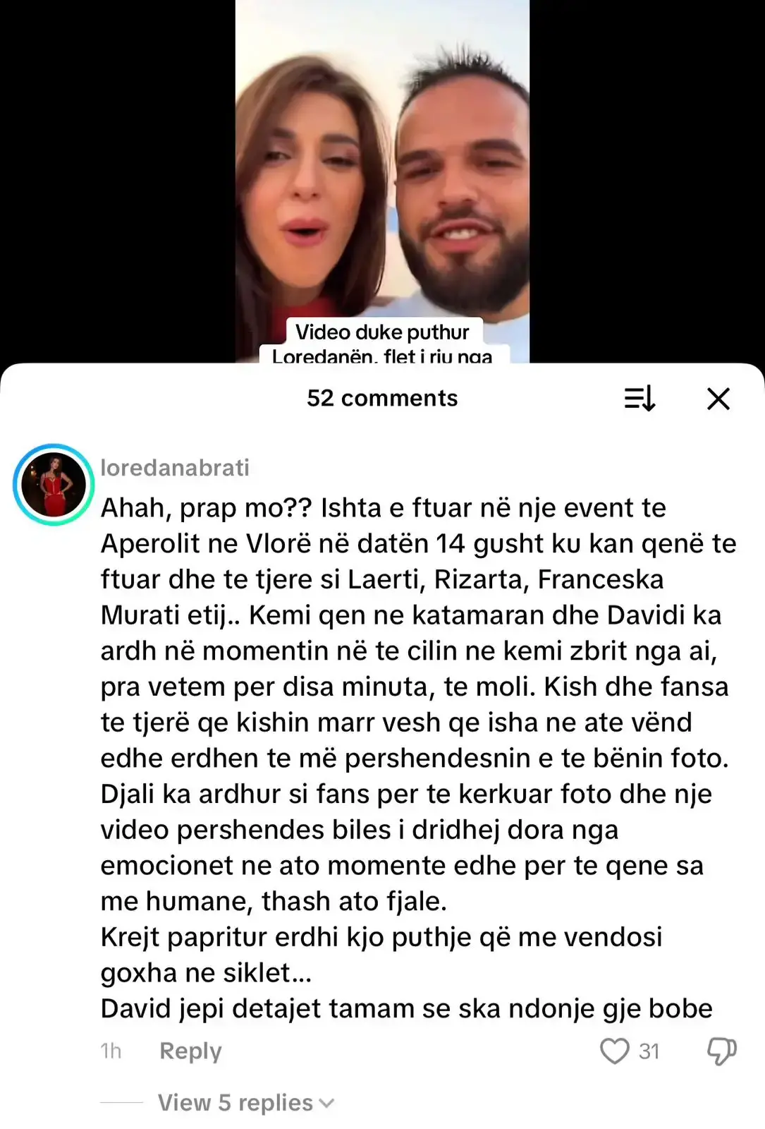 Pas publikimit të një videoje që bëri xhiron e rrjeteve sociale, ku djali David Dano shihet pranë Loredana Bratit duke e puthur në faqe, ka ardhur sqarimi i shumëpërfolur nga vetë ajo.