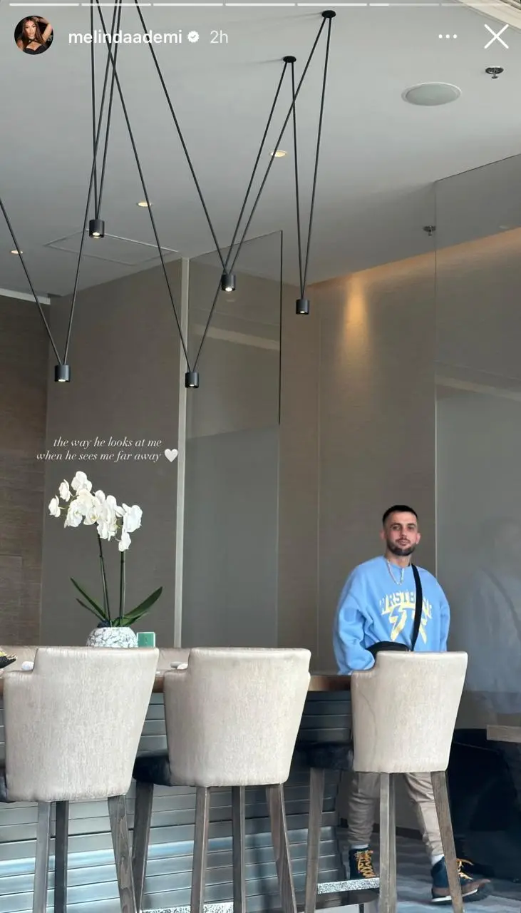 “Mënyra si shikon kur më sheh nga larg” – ka shkruar Melinda krahas një fotografie së postuar.