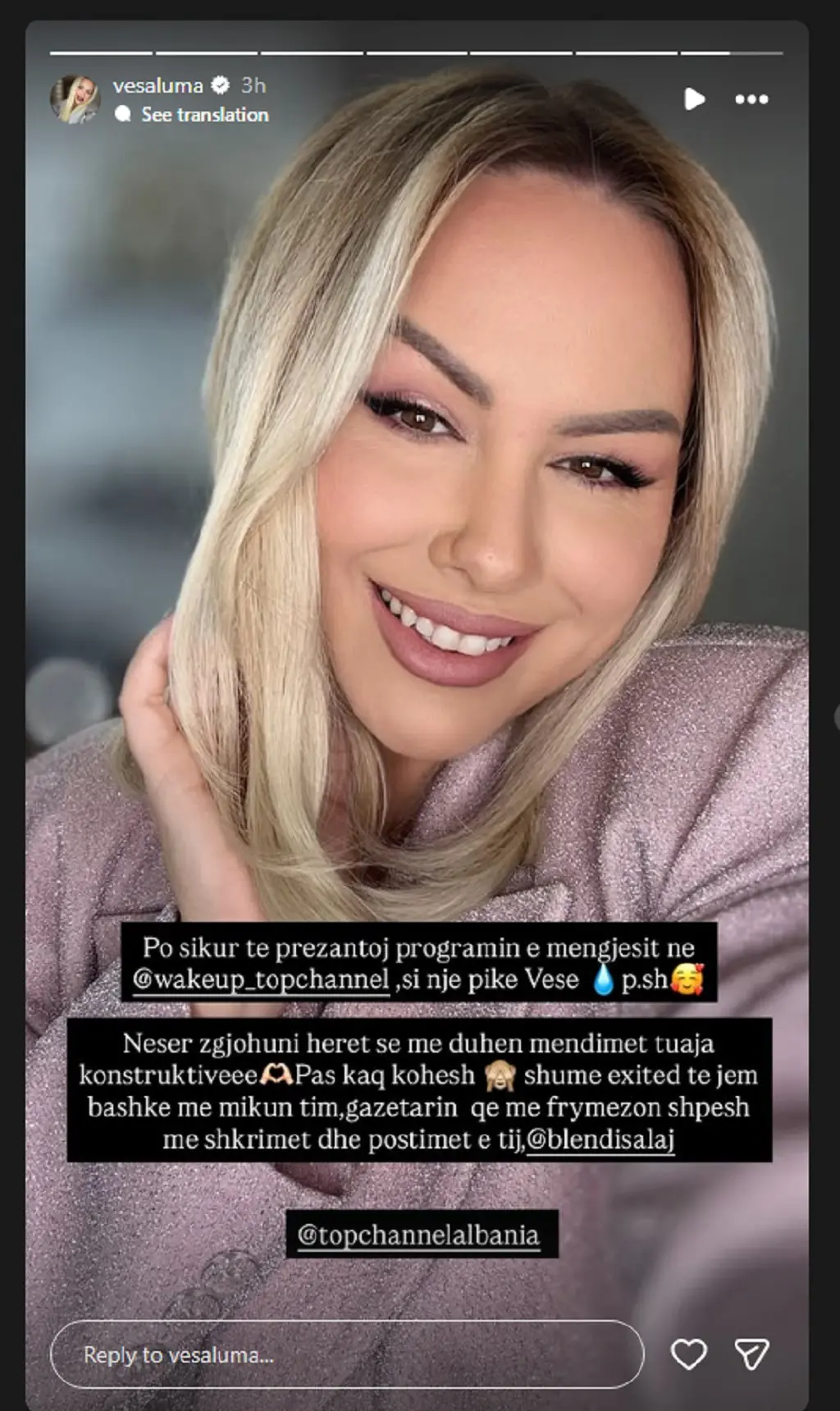 Neser zgjohuni heret se me duhen mendimet tuaja konstruktiveee Pas kaq kohesh shume exited te jem bashke me mikun tim, gazetarin qe me frymezon shpesh me shkrimet dhe postimet e tij,blendisalaj topchannelalbania”, shkroi ajo.