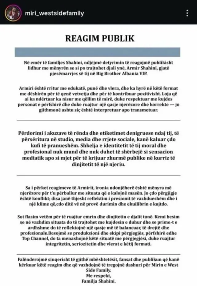 Familja e Mirit shpreson që ky reagim të ndihmojë në qartësimin e situatës dhe të rikthejë fokusin te vlerat e vërteta të njeriut, duke inkurajuar një diskutim më të shëndetshëm dhe më të respektueshëm rreth personazheve të njohur në media.