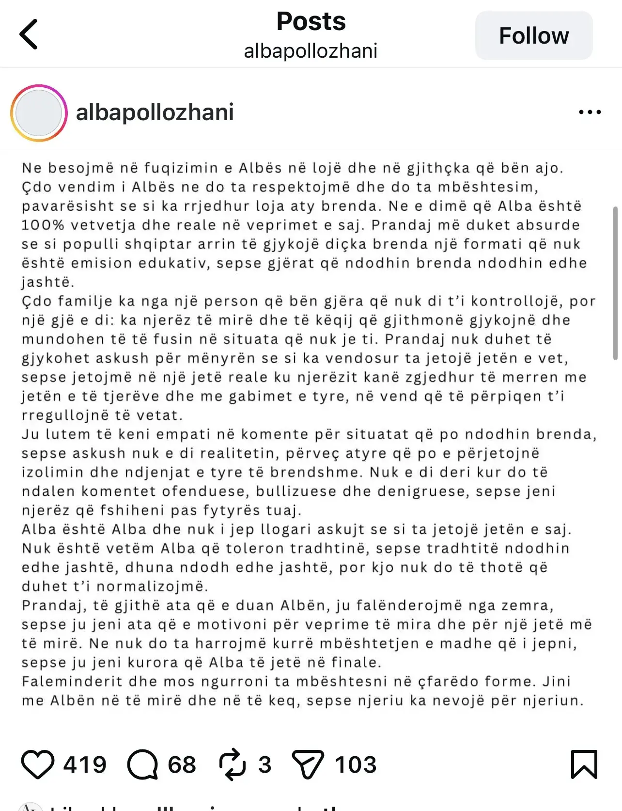Kjo gjë ka detyruar familjarët e Albës të reagojnë përmes një postimi nga llogaria e banores së BBVK.