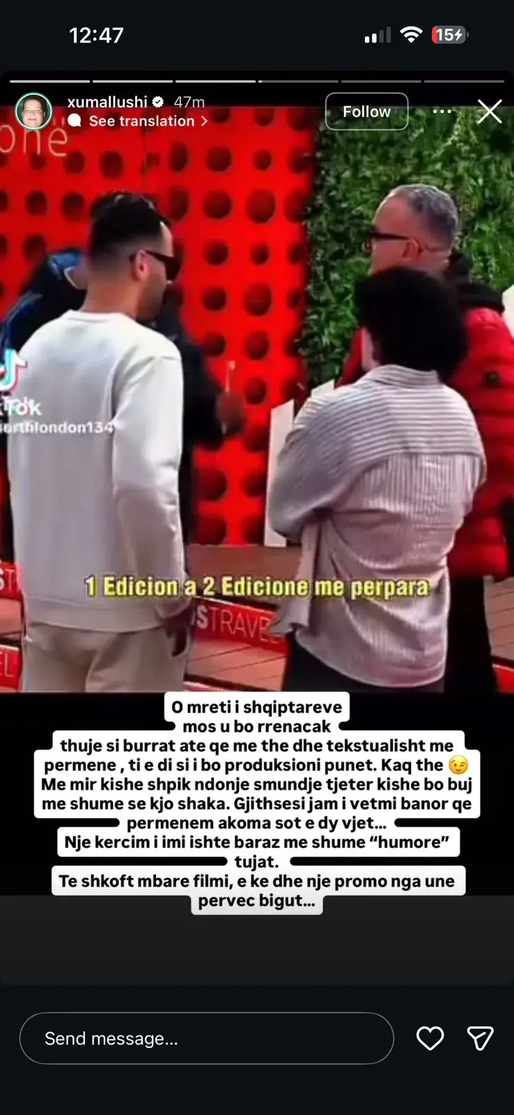 Nëse Luizi pretendoi se i kishte thënë Xumit që dritat fiken vetëm nëse nuk paguhet fatura, ish-banori ka reaguar ashpër në Instagram, duke e quajtur Luizin “gënjeshtar” dhe duke zbuluar, sipas tij, versionin e vërtetë të bisedës.