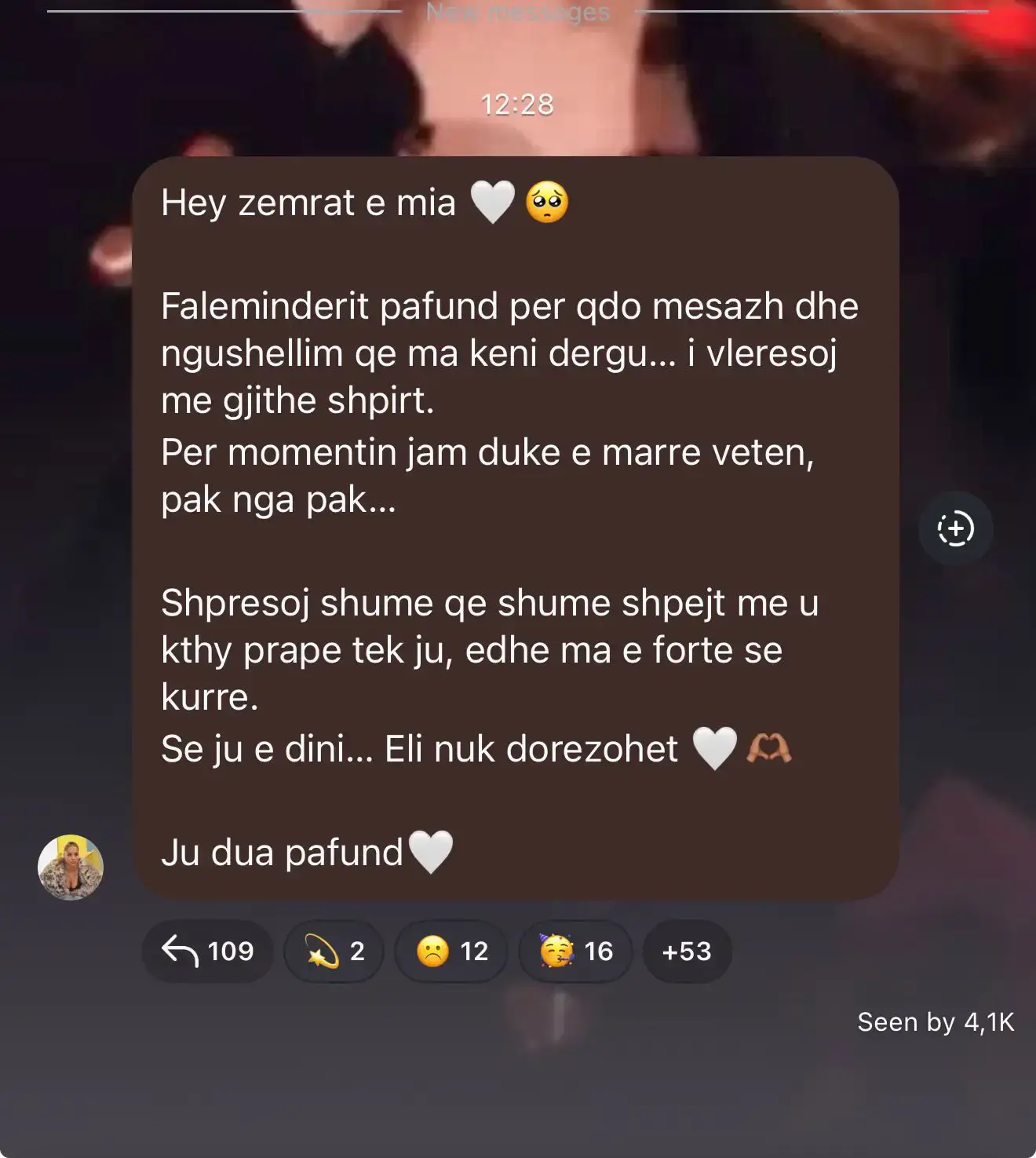 “Përshëndetje zemrat e mia! Ju falenderoj pafund për çdo mesazh dhe ngushëllim që ma keni dërguar… i vlerësoj me gjithë shpirt.