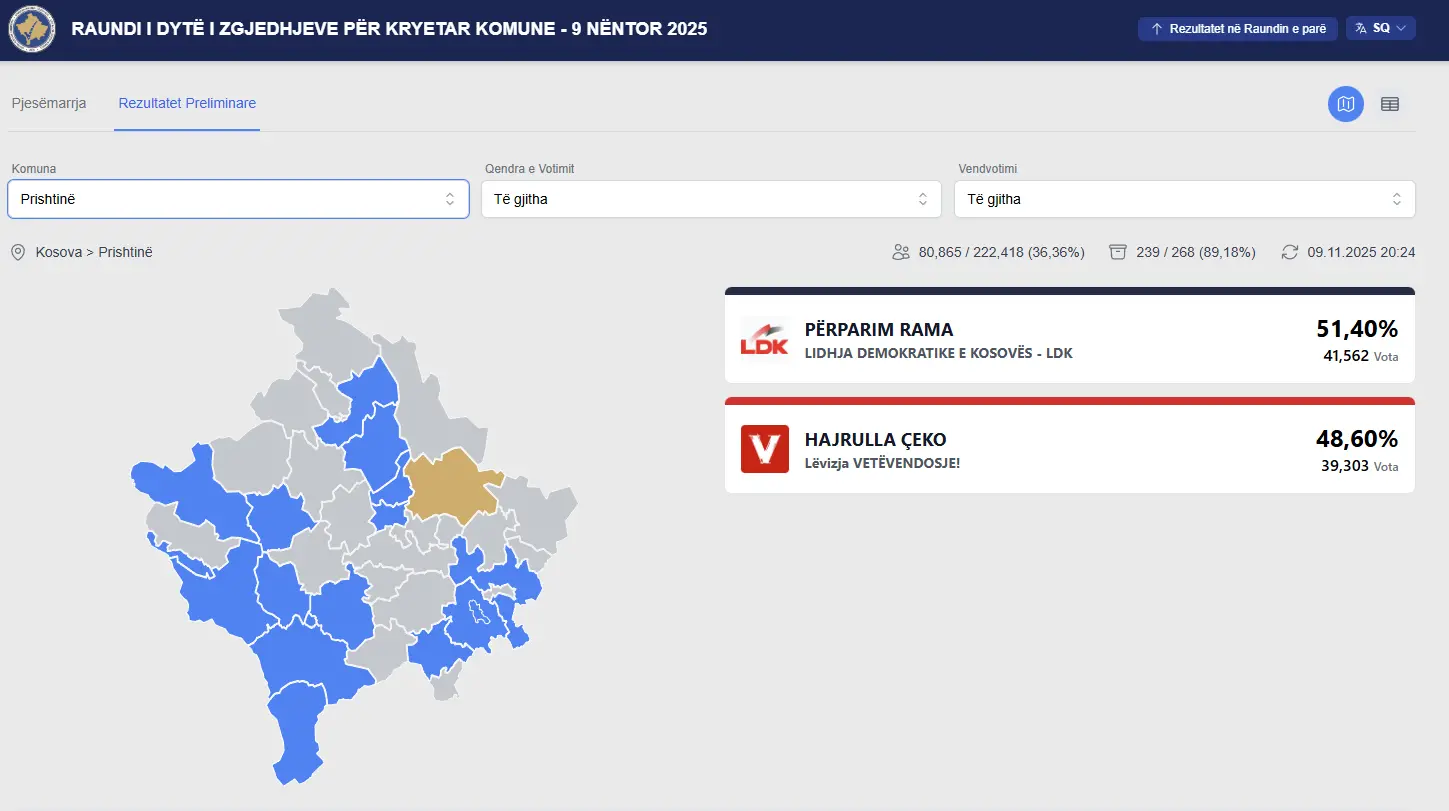 Kandidati i LDK-së aktualisht numëron 41,562 vota (51,40%).
