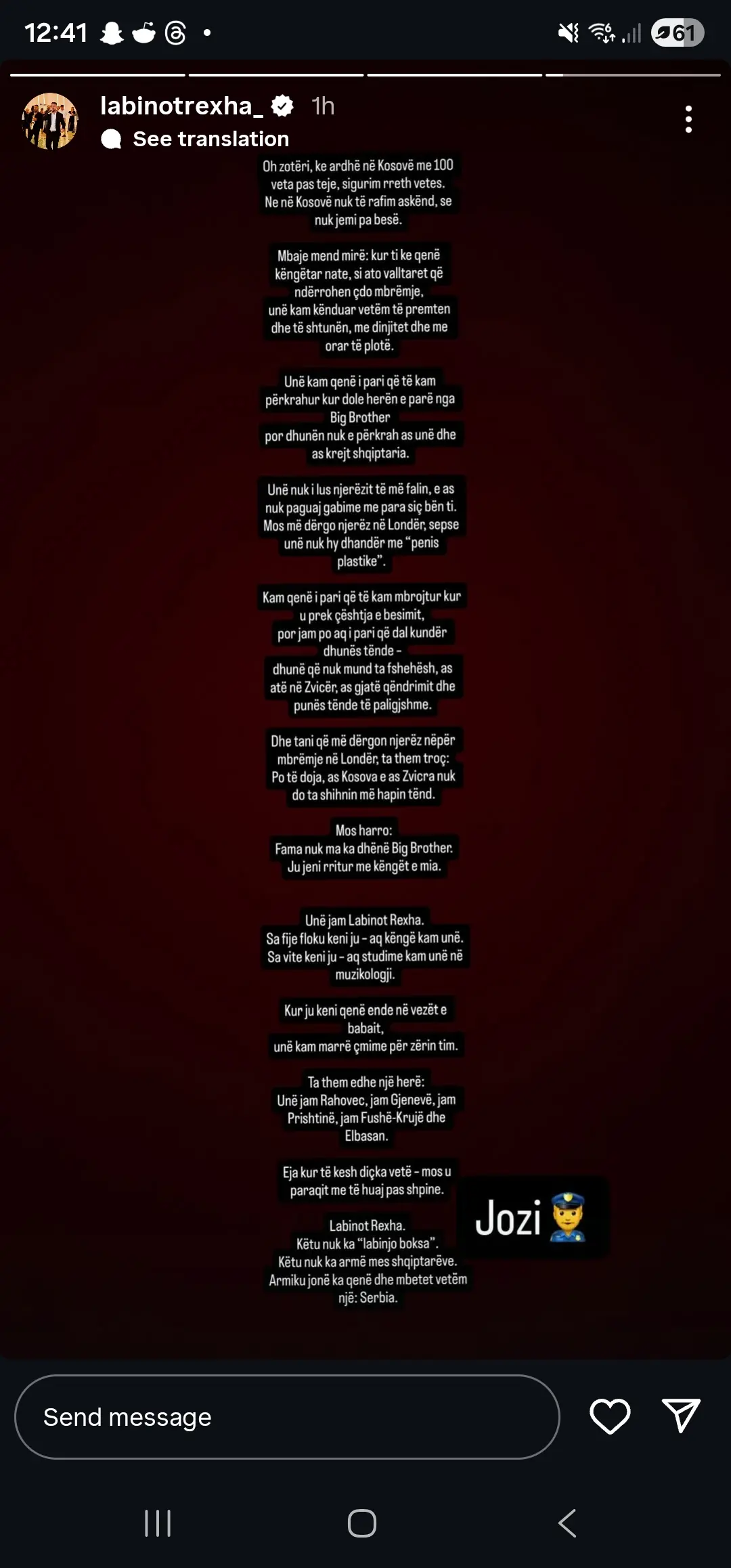 Labinot Rexha, i njohur si “Labi”, ka publikuar një mesazh të gjatë në formën e një “diss”-i në Instastory, ku akuzat e tij ndaj Jozit janë të rënda dhe të drejtpërdrejta.