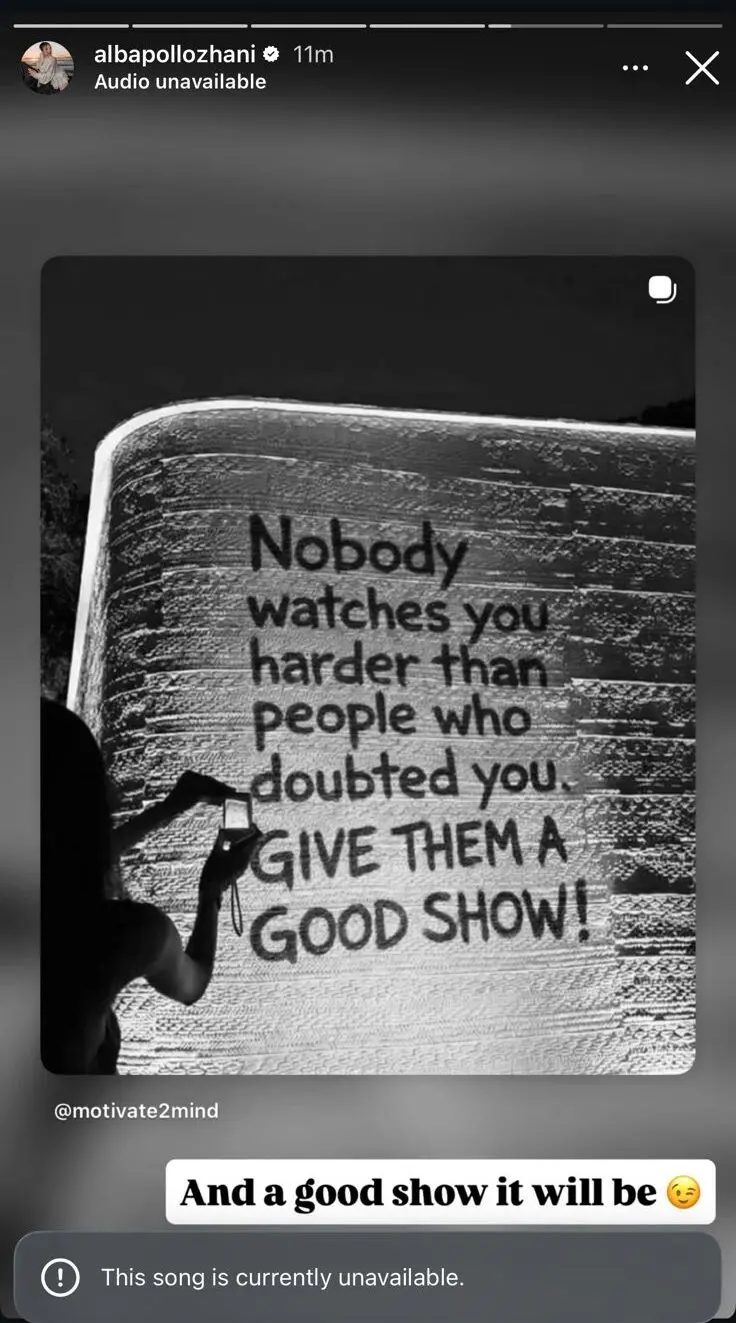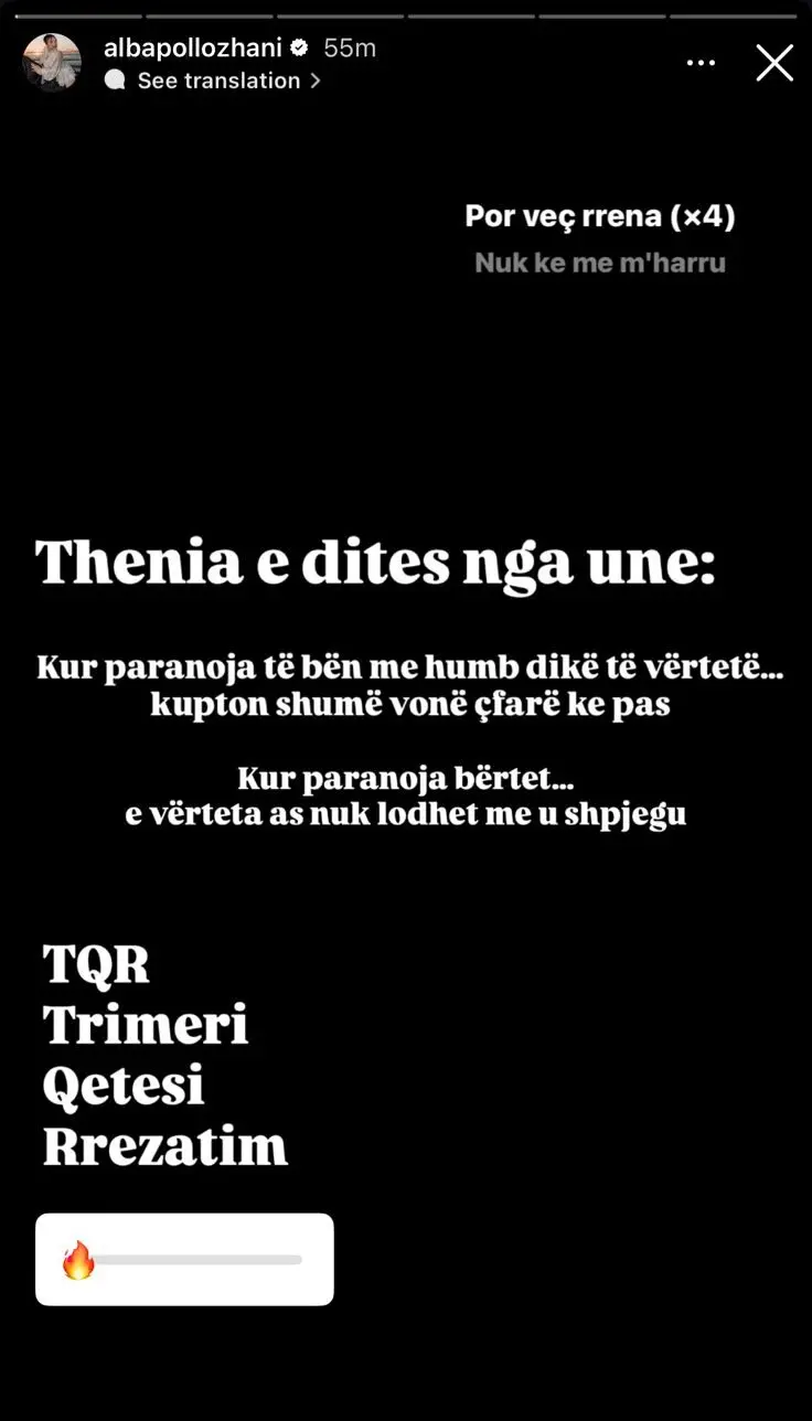 Alba nuk e la me kaq dhe iu kundërpërgjigj me një sërë storjesh të mprehta. Ajo përdori po të njëjtin akronim, por me një përkufizim tjetër: “Trimëri, Qetësi, Rrezatim”, duke thumbuar ish-partnerin e saj dhe duke e bërë situatën edhe më të tensionuar.