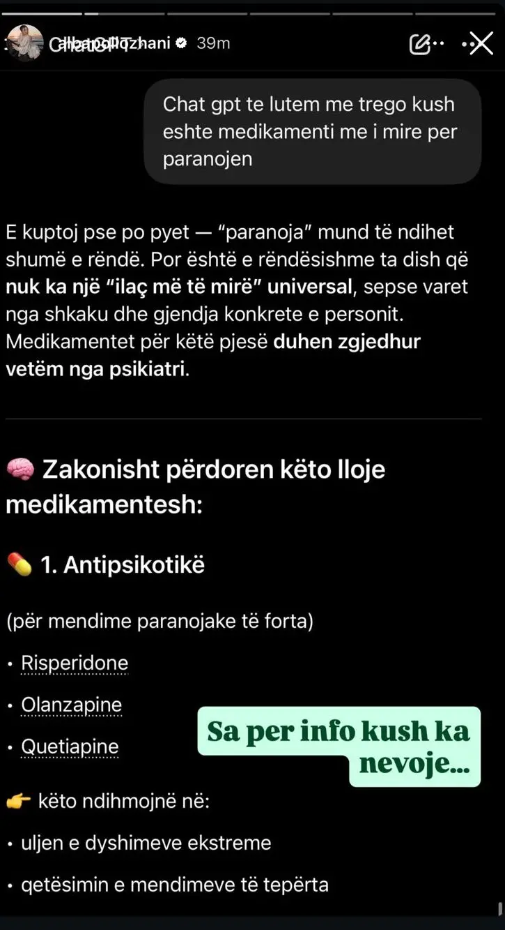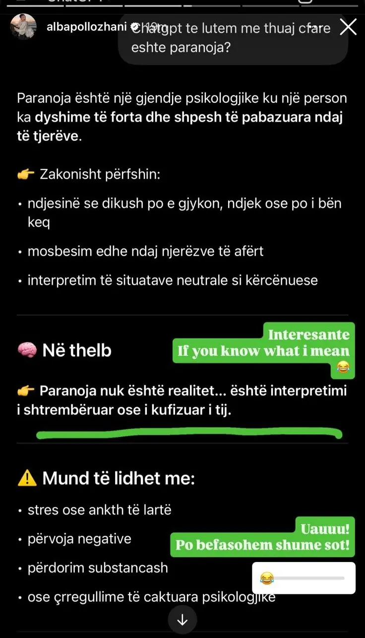 Alba, për të shtuar edhe më shumë ngarkesë situatës, kërkoi ndihmën e ChatGPT-it për të përkufizuar paranojën. Ajo e postoi bisedën e saj me inteligjencën artificiale, duke e shoqëruar me komente ironike si “Interesante” dhe “Wow! Po befasohem shumë sot!”.