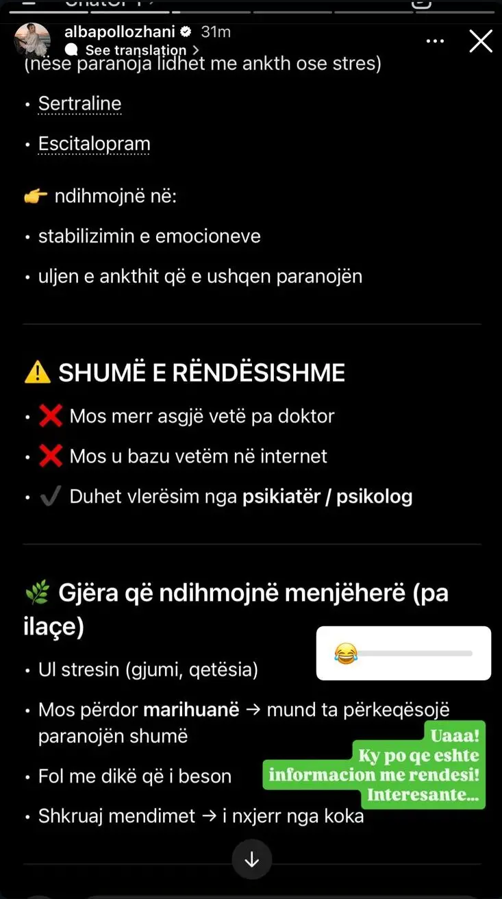 Një tjetër reagim i saj ishte një storje që fliste për paranojën, ku theksonte se “Kur paranoja të bën me humb dikë të vërtetë… kupton shumë vonë çfarë ke pas.” Ky postim duket se ishte një përgjigje e drejtpërdrejtë ndaj Lim Hotit.