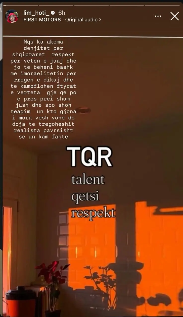 Çdo gjë nisi kur Lim Hoti postoi një storje në Instagram, ku kritikonte ashpër integritetin e shqiptarëve. Ai përdori akronimin “TQR”, duke e përkufizuar si “Talent, Qetësi, Respekt”, dhe sugjeroi se ka ende njerëz me fytyra të kamufluara, duke lënë të kuptohet se kishte fakte për të mbështetur pohimet e tij.