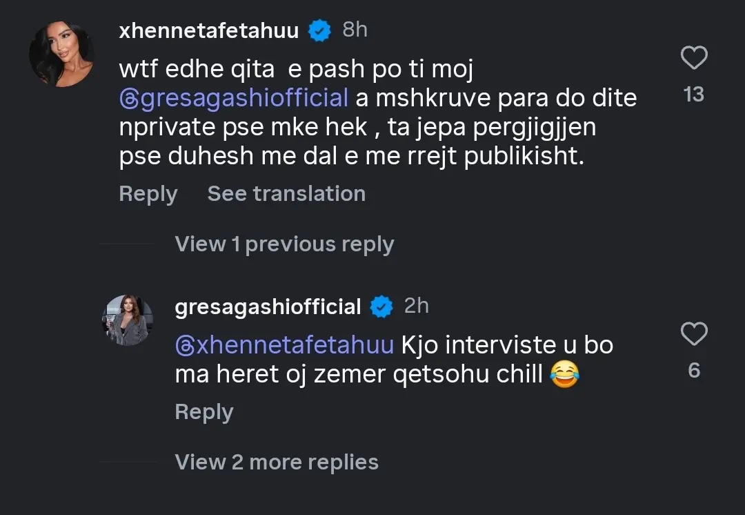 Ajo e shprehu hapur pakënaqësinë e saj, duke shkruar: “Wtf edhe qita e pash po ti moj Gresa, a m’shkruve para do dite n’private pse m’ke hek, ta jepa përgjigjen pse duhesh me dalë e me rrejt publikisht”.
