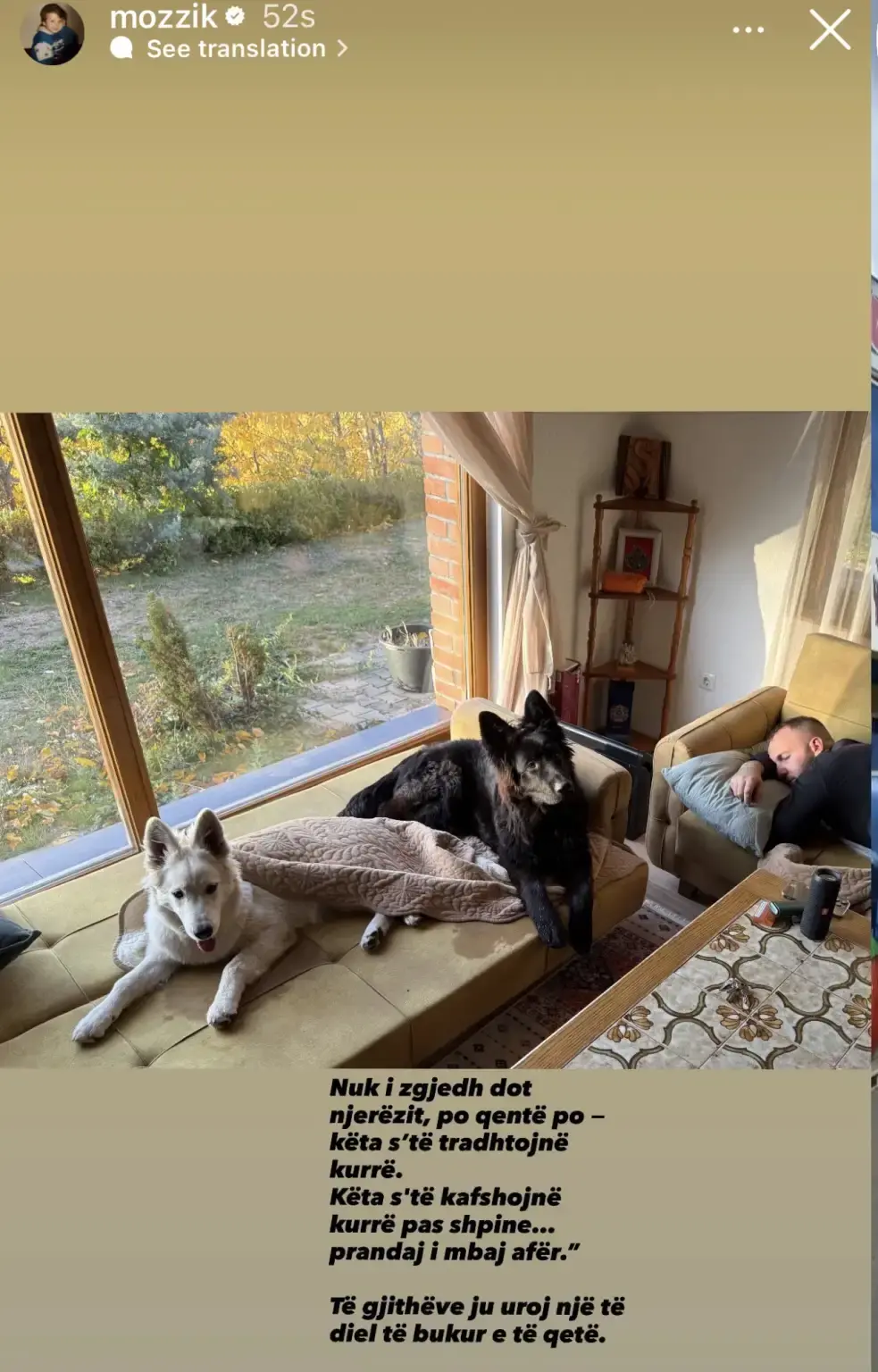 Në një foto të publikuar në profilin e tij, Mozzik ka shkruar: “Qentë s’të tradhtojnë kurrë, s’të kafshojnë pas shpine… prandaj i mbaj afër.”