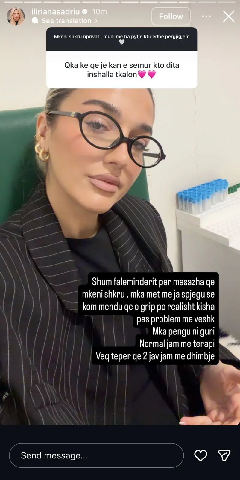 “Shumë faleminderit për mesazhet që më keni shkruar. Më ka mbet me ja shpjegu se kam mendu që o grip, po realisht kisha pas problem me veshkë. Më ka pengu një guri. Normal jam me terapi, veç teper që 2 javë jam me dhimbje,” u shpreh ajo.