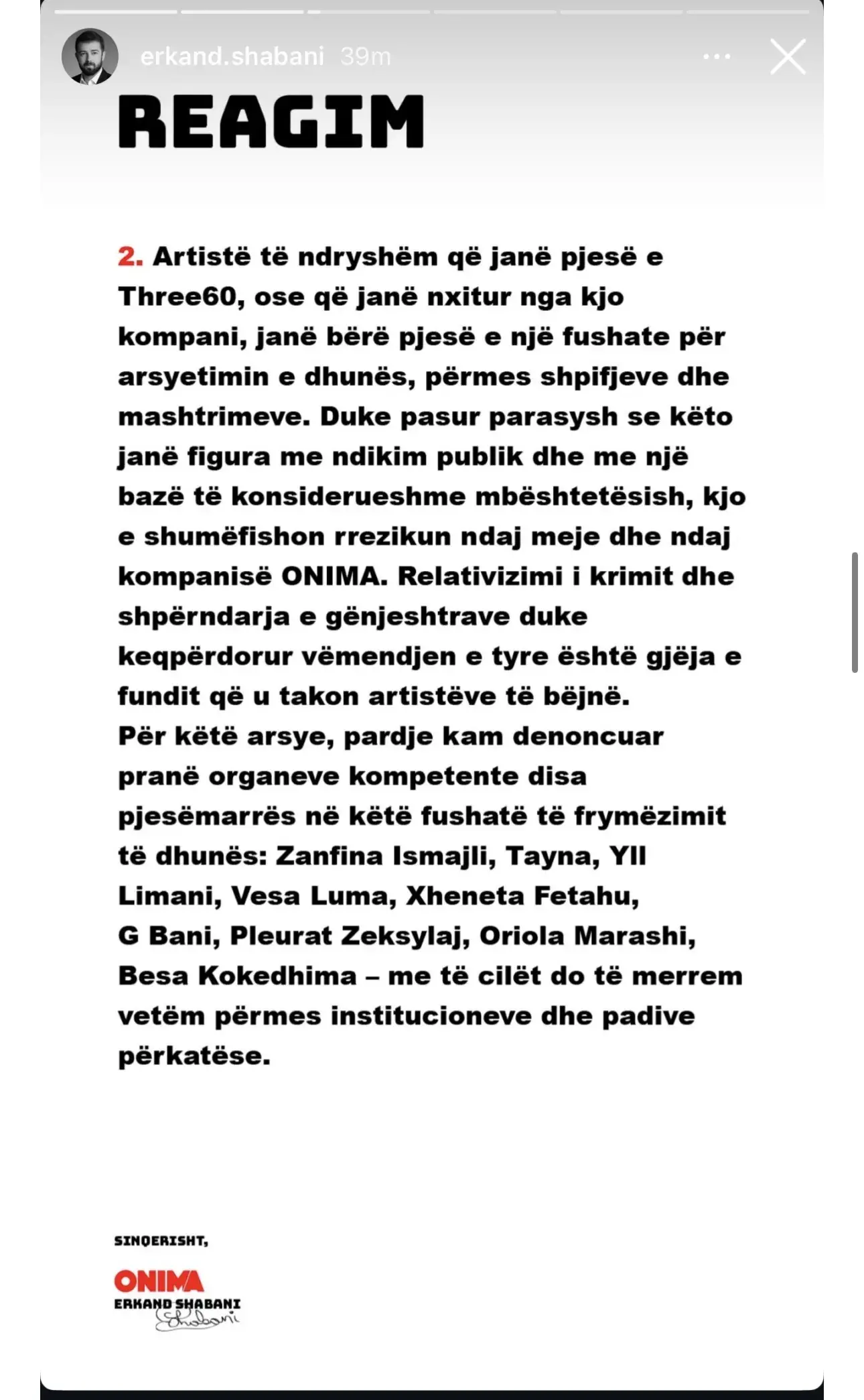 Megjithatë, pronari i ONIMA-s, Erkand Shabani, i është përgjigjur kësaj mbështetjeje me veprime ligjore.