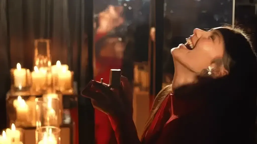 Ngjarja e veçantë u zhvillua në një ambient të mbushur me atmosferë mistike, ku drita e qirinjve dhe pasqyrat e mëdha krijuan një skenë magjike. Ky moment i rëndësishëm për çiftin u shoqërua me emocione të forta dhe një ndriçim të zbehtë që theksonte dramatizmin e propozimit.