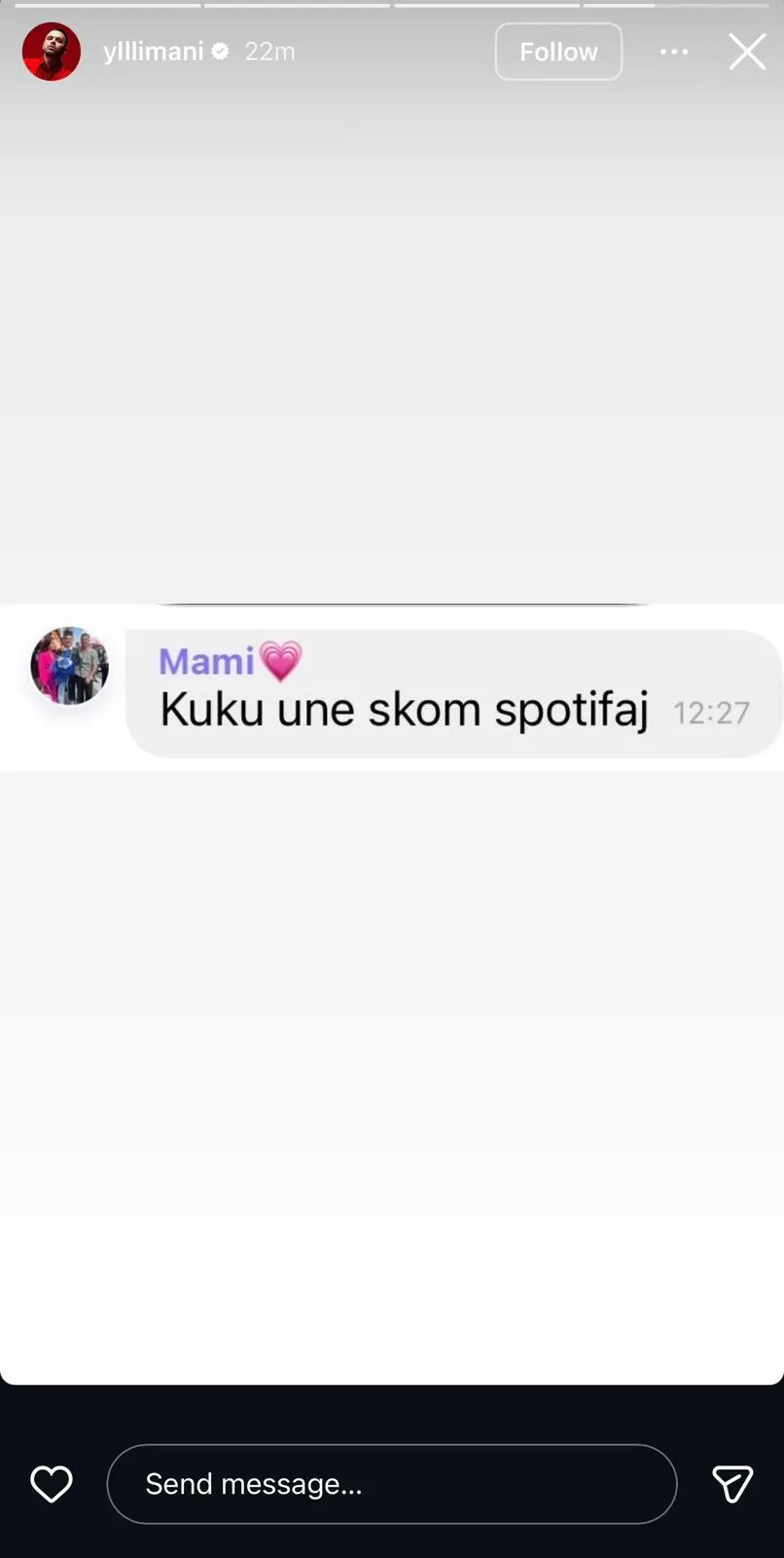 Në një postim të veçantë në InstaStory, ajo ka ndarë një mesazh të sinqertë dhe humoristik, duke zbuluar se nuk ka akses në platformën Spotify për të dëgjuar këngën e djalit të saj.