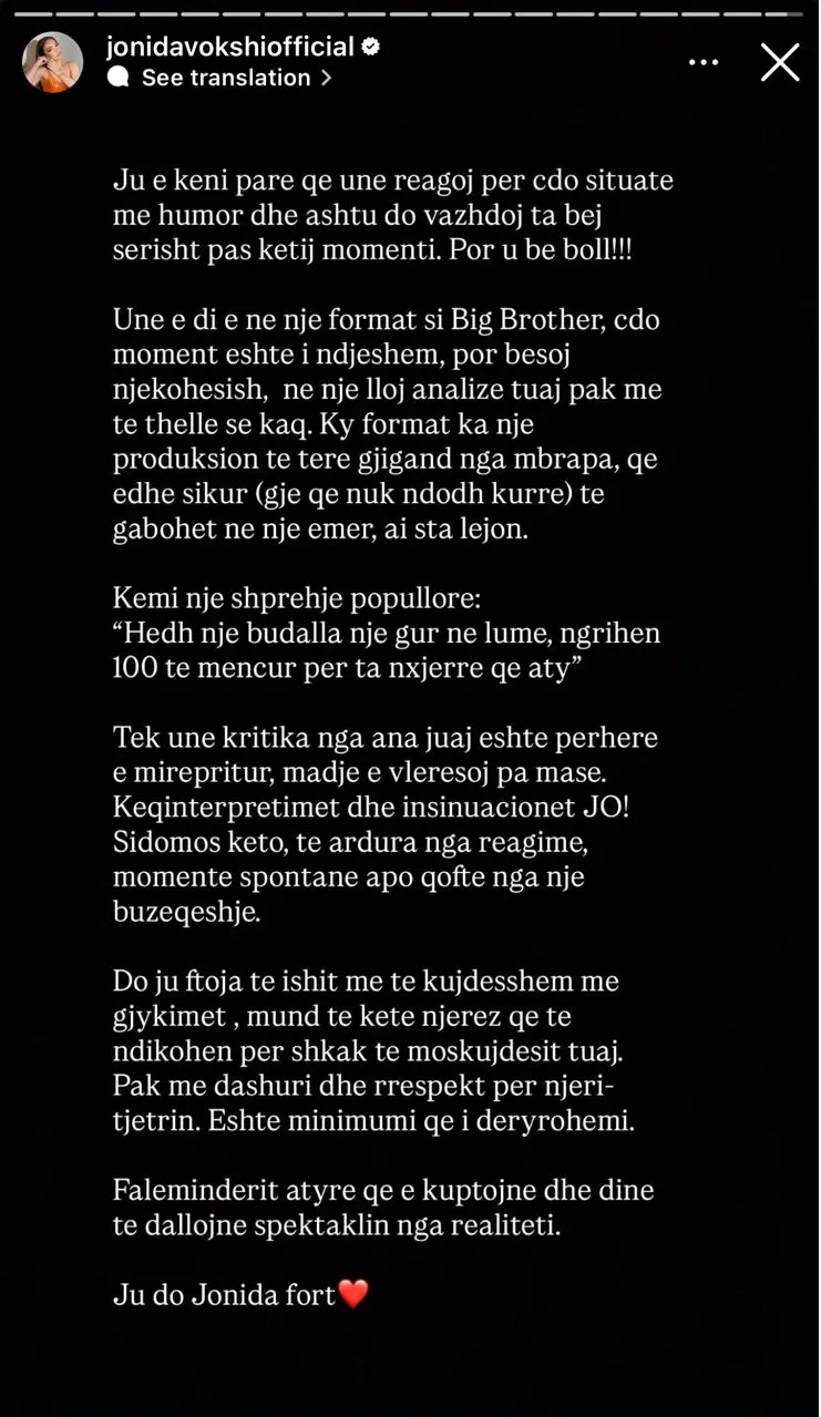 Në përfundim, Jonida ka bërë thirrje për më shumë dashuri dhe respekt në gjykime, duke kërkuar nga ndjekësit që të bëjnë dallimin mes spektaklit dhe realitetit.
