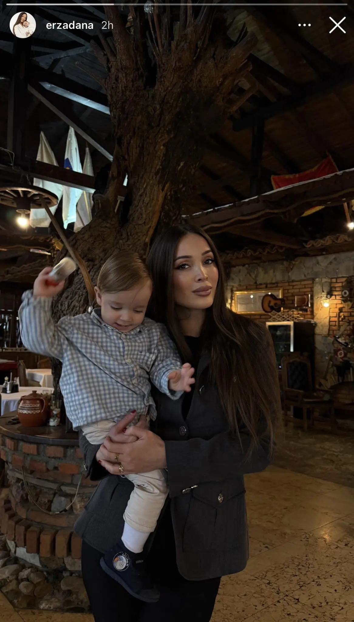 Fotografia e shpërndarë tregon Erza Danën duke mbajtur në krahë djalin e saj, një moment i veçantë që ka emocionuar ndjekësit e saj.