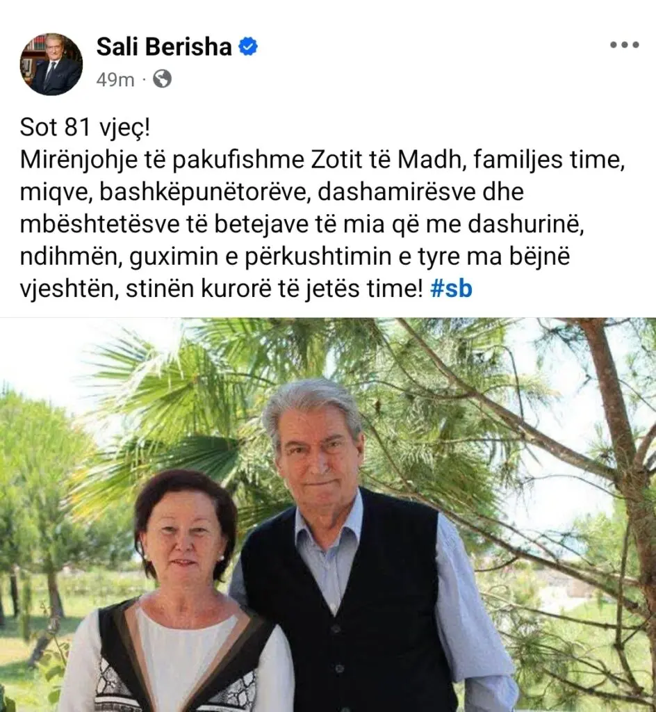 “Sot 81 vjeç! Mirënjohje të pakufishme Zotit të Madh, familjes time, miqve, bashkëpunëtorëve, dashamirësve dhe mbështetësve të betejave të mia që me dashurinë, ndihmën, guximin e përkushtimin e tyre ma bëjnë vjeshtën, stinën kurorë të jetës time”, ka shkruar Berisha në një postim në Facebook, duke ndarë një foto me bashkëshorten e tij, Liri Berisha.