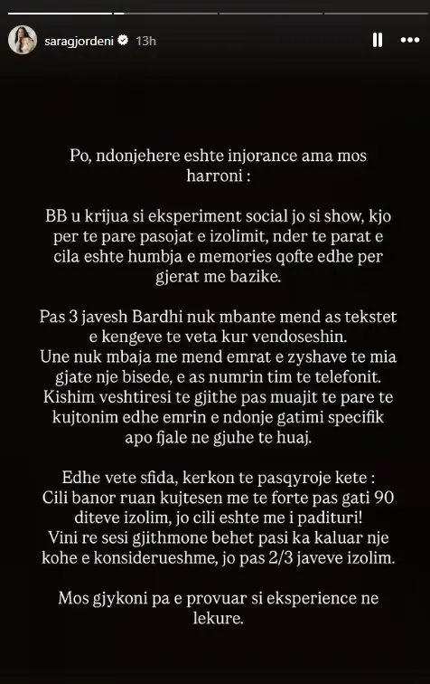Ish-banorja e edicionit të tretë të “Big Brother VIP Albania”, Sara Gjordeni, ka ndarë përvojat e saj të pazakonta nga izolimi në një postim të fundit në rrjetet sociale.