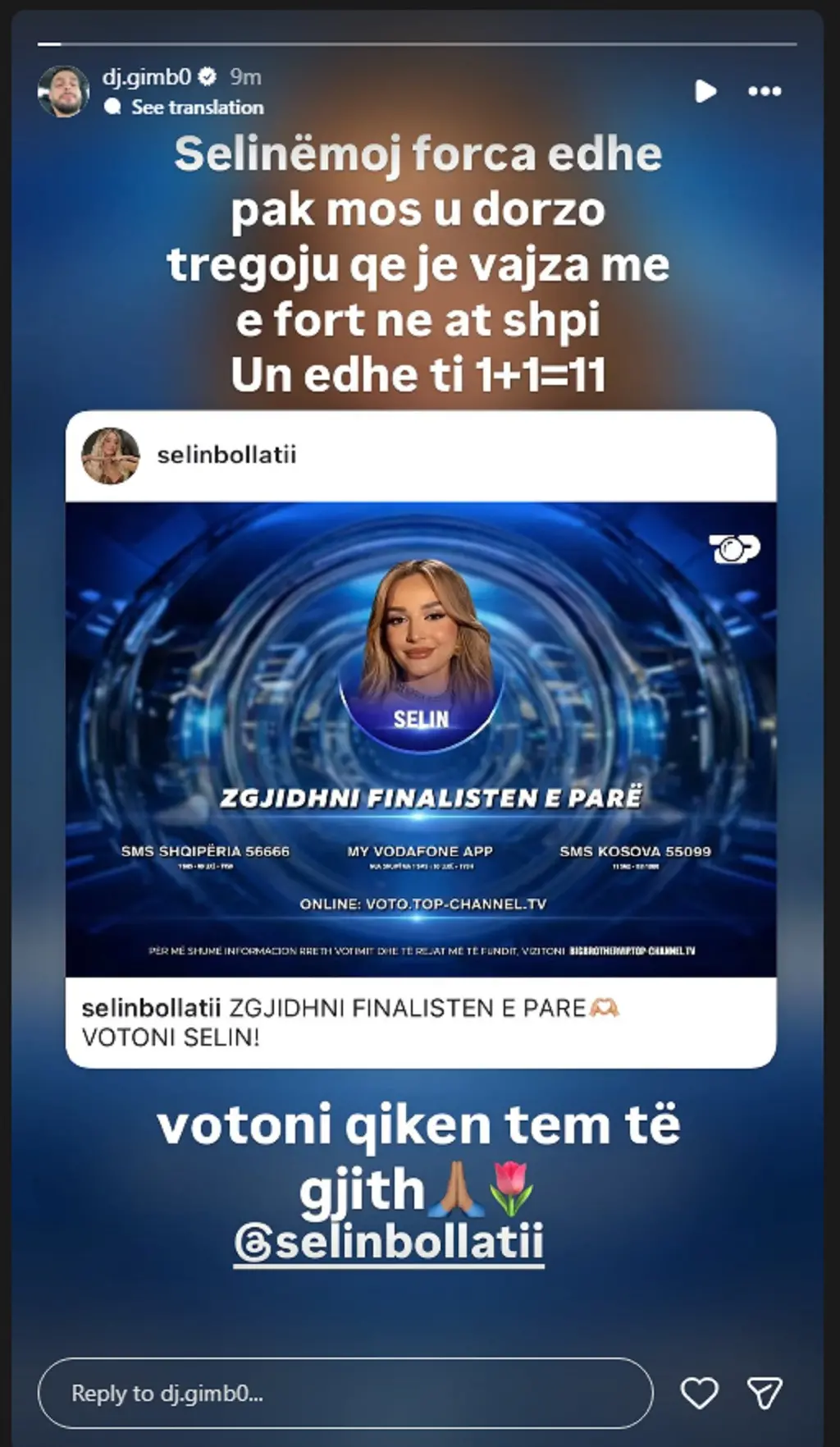 “Selinë moj forca edhe pak mos u dorzo tregoju qe je vajza me e fort ne at shpi. Un dhe ti 1+1=11.