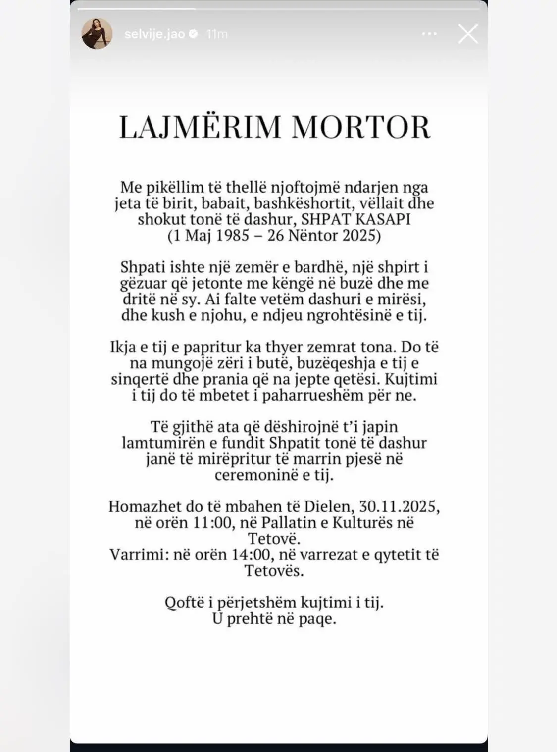 Ajo ka shpërndarë një story ku informon për datën dhe orarin e ceremonisë mortore, duke u drejtuar miqve dhe familjarëve që kanë shprehur mbështetje dhe ngushëllime gjatë këtyre ditëve të vështira.