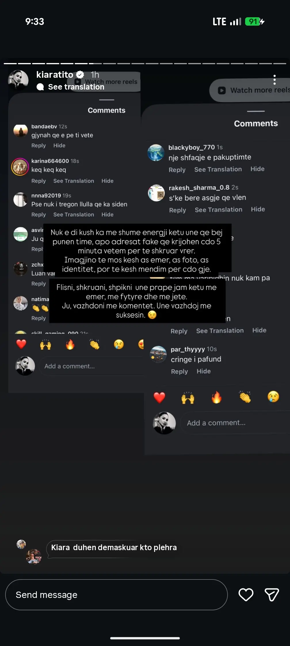 Me një reagim të fortë, ajo ka vendosur të demaskojë publikisht sulmet që po përjeton. Kiara ka publikuar disa screenshot-e të komenteve negative, të cilat vinin kryesisht nga profile pa foto ose me emra të dyshimtë, duke vënë në dukje se këto komente nuk janë të rastësishme.