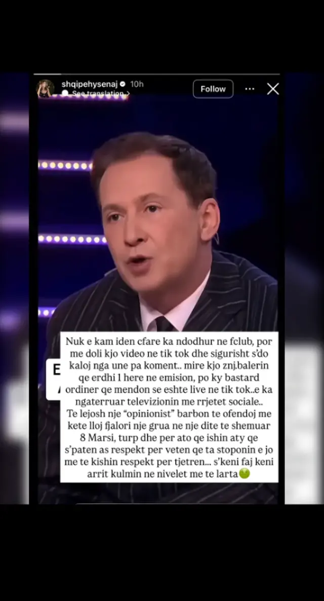 “Ky bastard, ordiner që mendon se është live në TikTok… e ka ngatërruar televizionin me rrjetet sociale,” – shkruan Shqipe e revoltuar, duke theksuar se sjellja e tij është e papërshtatshme, sidomos në një ditë të shënuar si 8 Marsi.