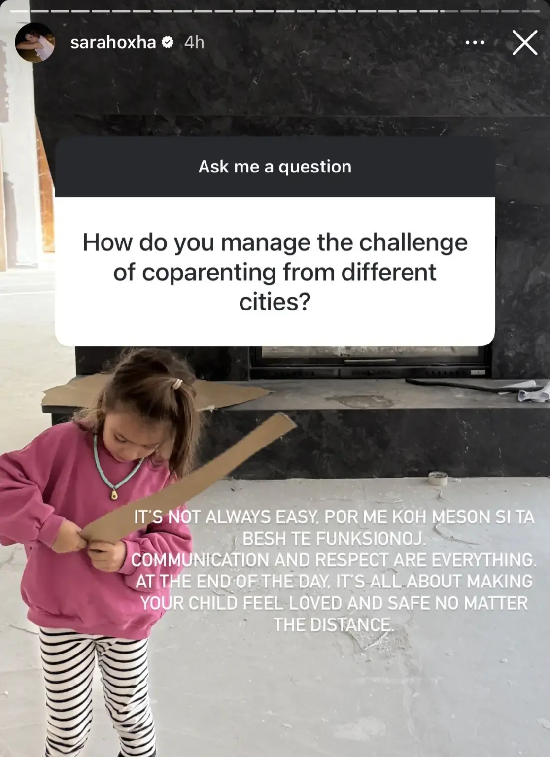 Gjatë një sesioni interaktiv në Instagram, një ndjekës e pyeti Sarën se si e menaxhon sfidën e bashkë-prindërimit kur jetojnë në qytete të ndryshme.