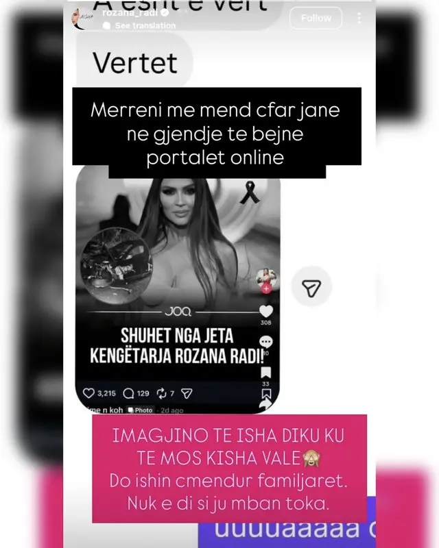 Në postimin e saj, Rozana ndau pamjet e postimit të rremë në “InstaStory” dhe e shoqëroi me një koment ironik për veprimet e portaleve që shpeshherë përpiqen të fitojnë klikime me lajme të tilla. Ajo theksoi se disa faqe janë të gatshme të shkojnë deri në ekstrem për të tërhequr vëmendjen e publikut.