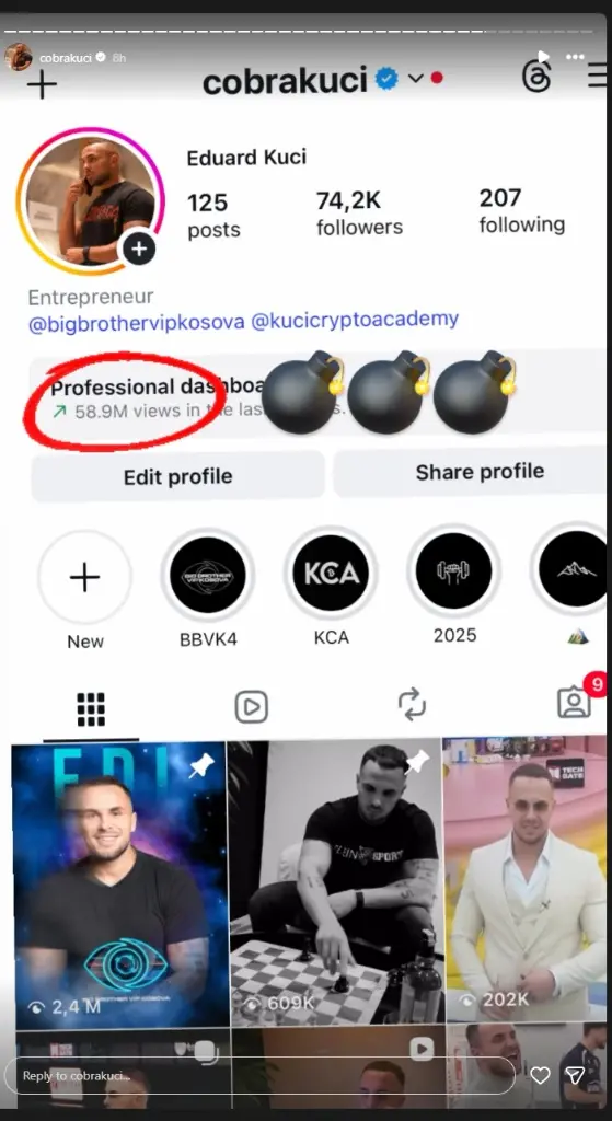 Statistikat e fundit nga “Professional Dashboard” në Instagramin e tij kanë zbuluar një shifër marramendëse: 58.9 milionë shikime vetëm në 30 ditët e fundit. Kjo tregon se Edi ka arritur të krijojë një lidhje të fortë me ndjekësit e tij.