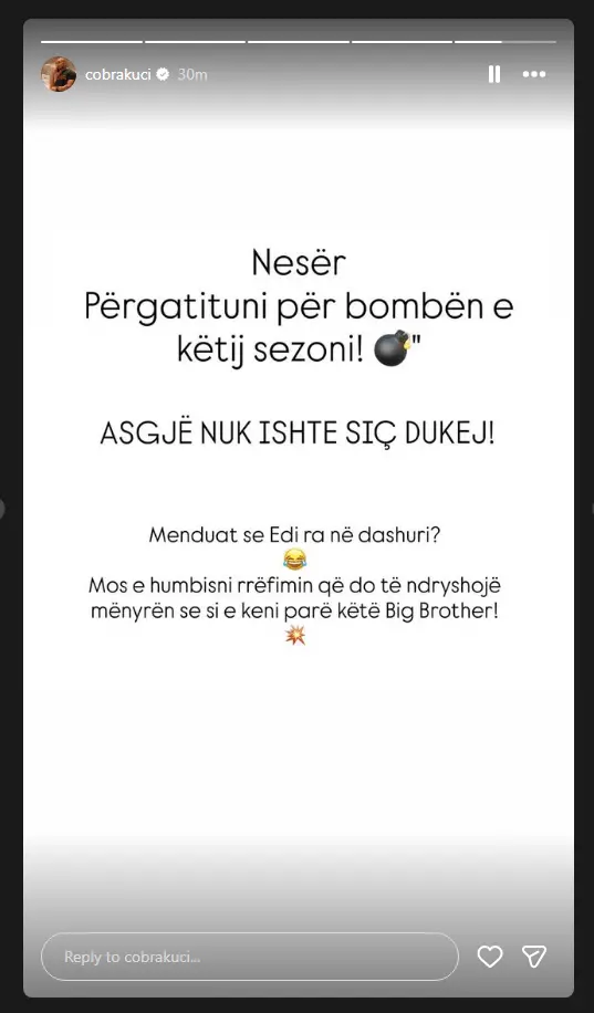 Ish-banori i “Big Brother VIP Kosova”, Edi Kuçi, ka bërë një reagim që ka tërhequr vëmendjen e ndjekësve në rrjete sociale, duke paralajmëruar se shumë shpejt do të zbardhë të vërtetën për raportin e tij me banores aktuale të shtëpisë, Dolcen.