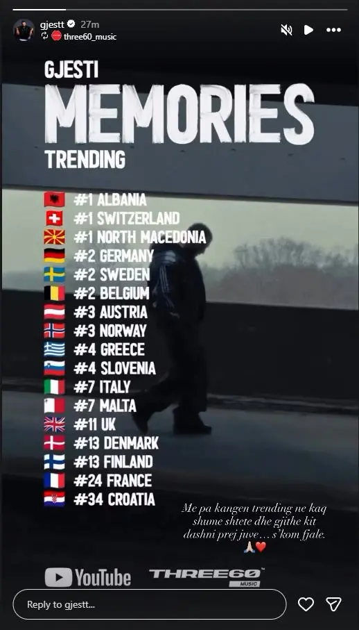 “Më pa këngën trending në kaq shumë shtete dhe gjithë këtë dashni prej juve, s’kam fjalë”, ka shkruar ai, duke shprehur mirënjohjen e tij për mbështetje. Kjo tregon se sa e rëndësishme është për artistët të ndjejnë dashurinë e publikut për punën e tyre.