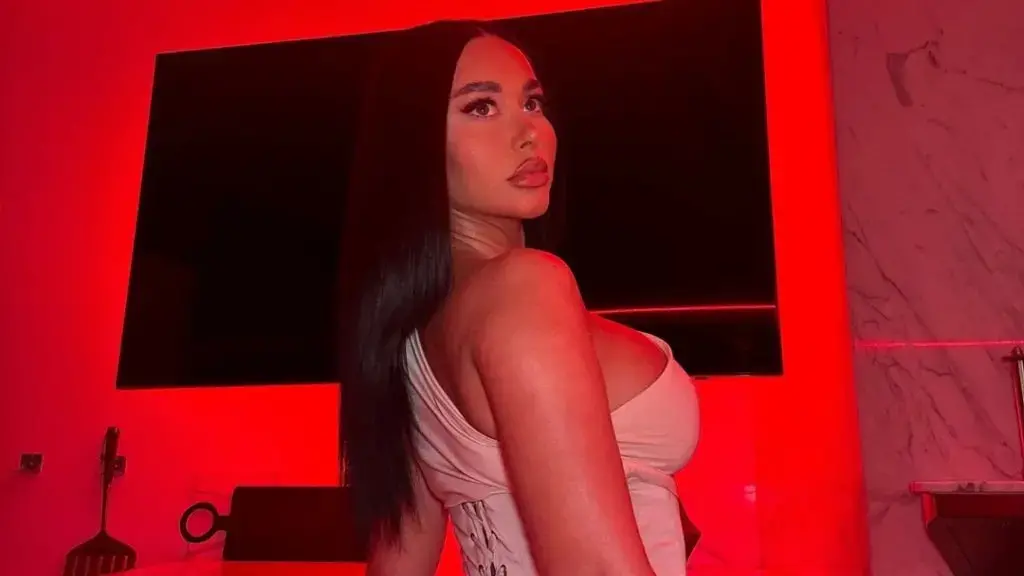 E veshur me një bluzë të bardhë të shkurtër, ajo shfaqet në një parkim të zymtë, duke krijuar një kontrast mahnitës me shkëlqimin e saj natyral.