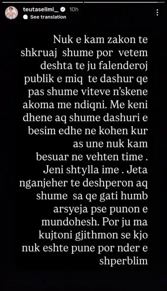 Në një postim të saj në InstaStory, Teuta ka rrëfyer për fazat e dyshimit dhe mungesës së besimit në vetvete.