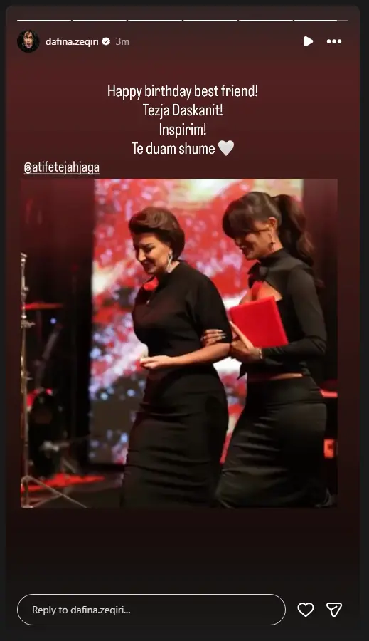 Duke postuar një fotografi ku të dyja u shfaqen të veshura zi ajo shkroi: “Happy birthday best friend! Tezja Daskanit! Inspirim! Te duam shumë”.