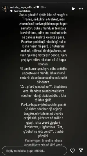 “Sot si çdo ditë tjetër, isha në rrugët e Tiranës, në kulmin e trafikut, mes zhurmës së borive që biën sapo hapet semafori, duke u munduar të mbaja korsinë time, edhe pse makinat ishin në garë se kush të kalonte e para. Papritur pashë një ndodhi që nuk e kisha hasur më parë. E hutuar në makinë, ndërsa i këndoja Aurës, po vinin një varg motorësh policie.”