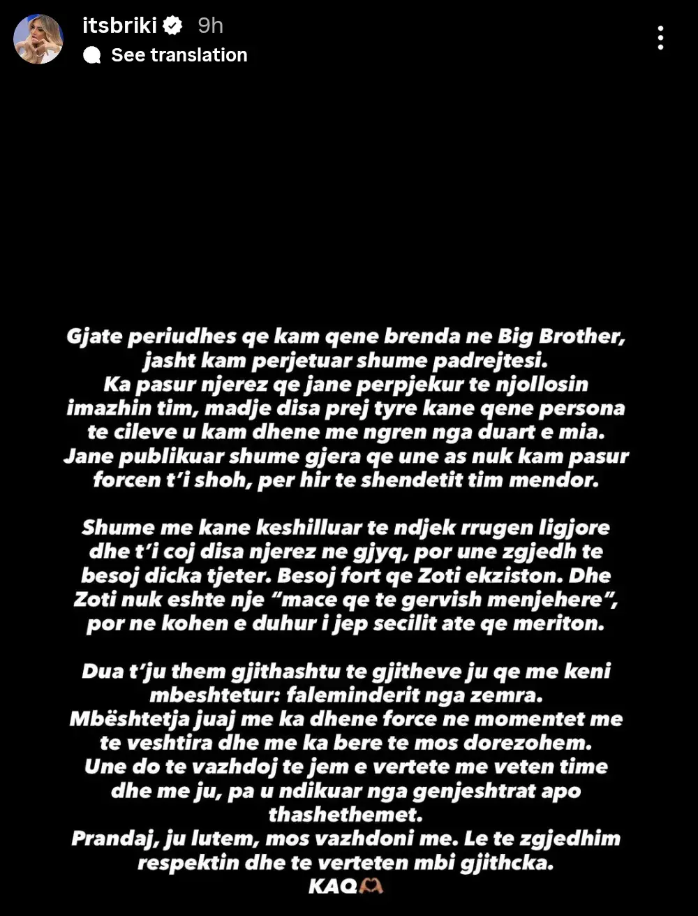 Përmes një statusi të gjatë në Instastory, Brikena ka shprehur zhgënjimin e saj të thellë, jo vetëm për publikimin e këtyre pamjeve që, sipas saj, kanë synuar t’i cenojnë imazhin, por edhe për “tradhtinë” nga njerëz të afërt.