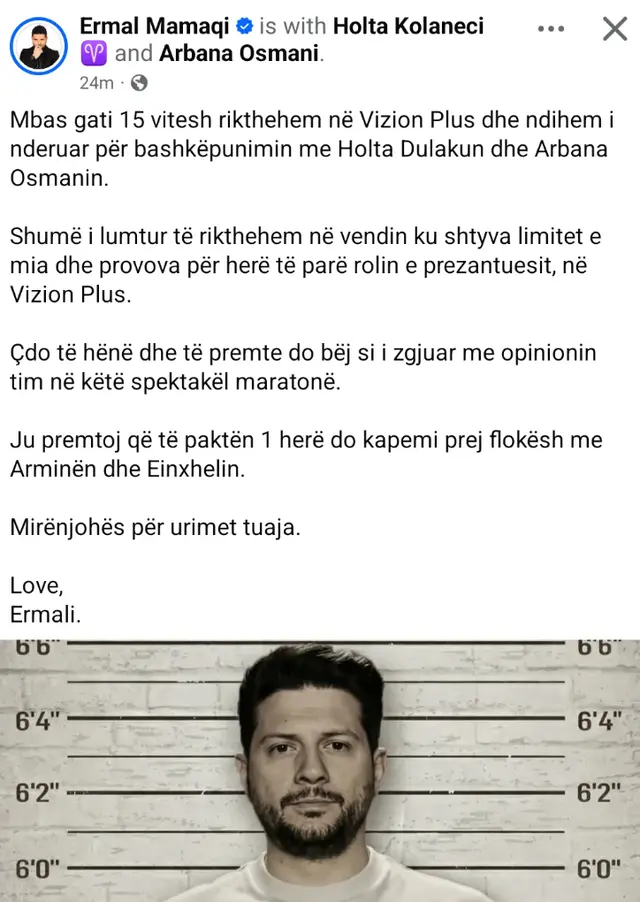 “Mbas gati 15 vitesh rikthehem në Vizion Plus dhe ndihem i nderuar për bashkëpunimin me Holta Dulakun dhe Arbana Osmanin. Shumë i lumtur të rikthehem në vendin ku shtyva limitet e mia dhe provova për herë të parë rolin e prezantuesit,” shkruan ai në postimin e tij, duke shprehur mirënjohjen për mbështetje nga ndjekësit.