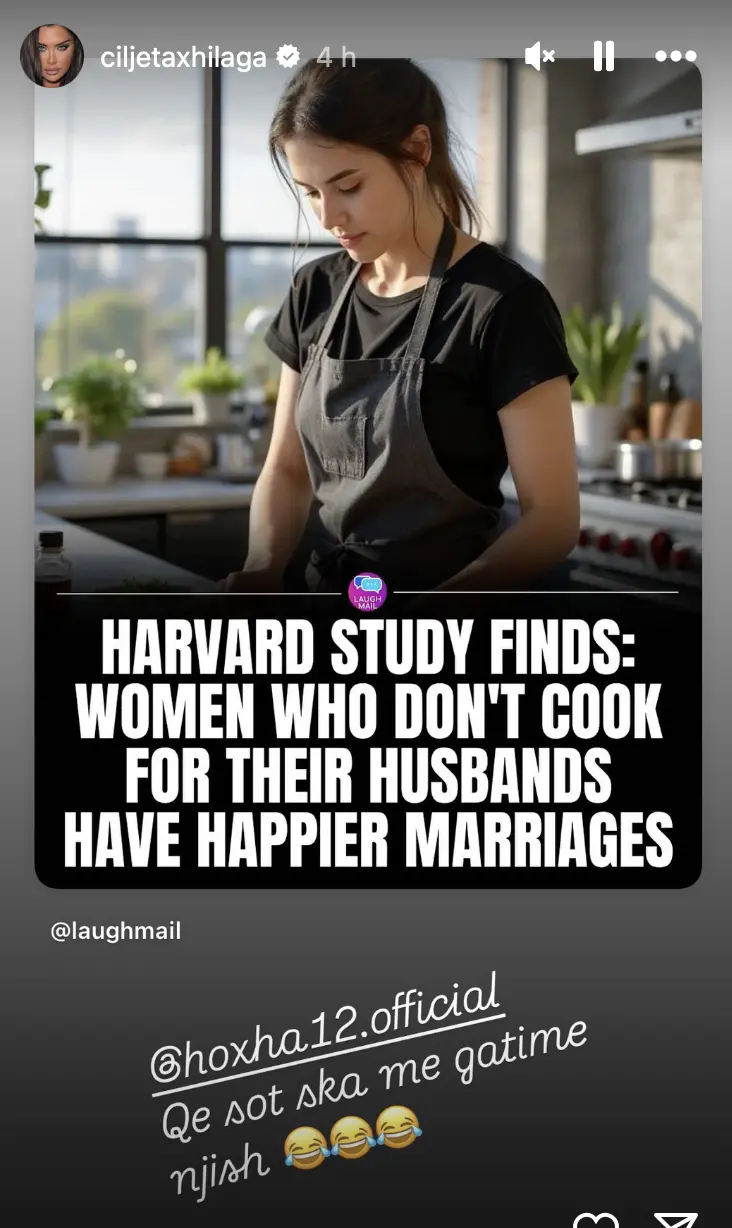 Postimi i saj në Instastory ka përfshirë një foto të veçantë, e cila shoqërohet me një mbishkrim intrigues. Ajo ka cituar një studim të Harvardit që thotë se gratë që nuk gatuajnë për burrat e tyre kanë martesa më të lumtura. Ky informacion ka ngjallur diskutime dhe komente të shumta në rrjetet sociale.