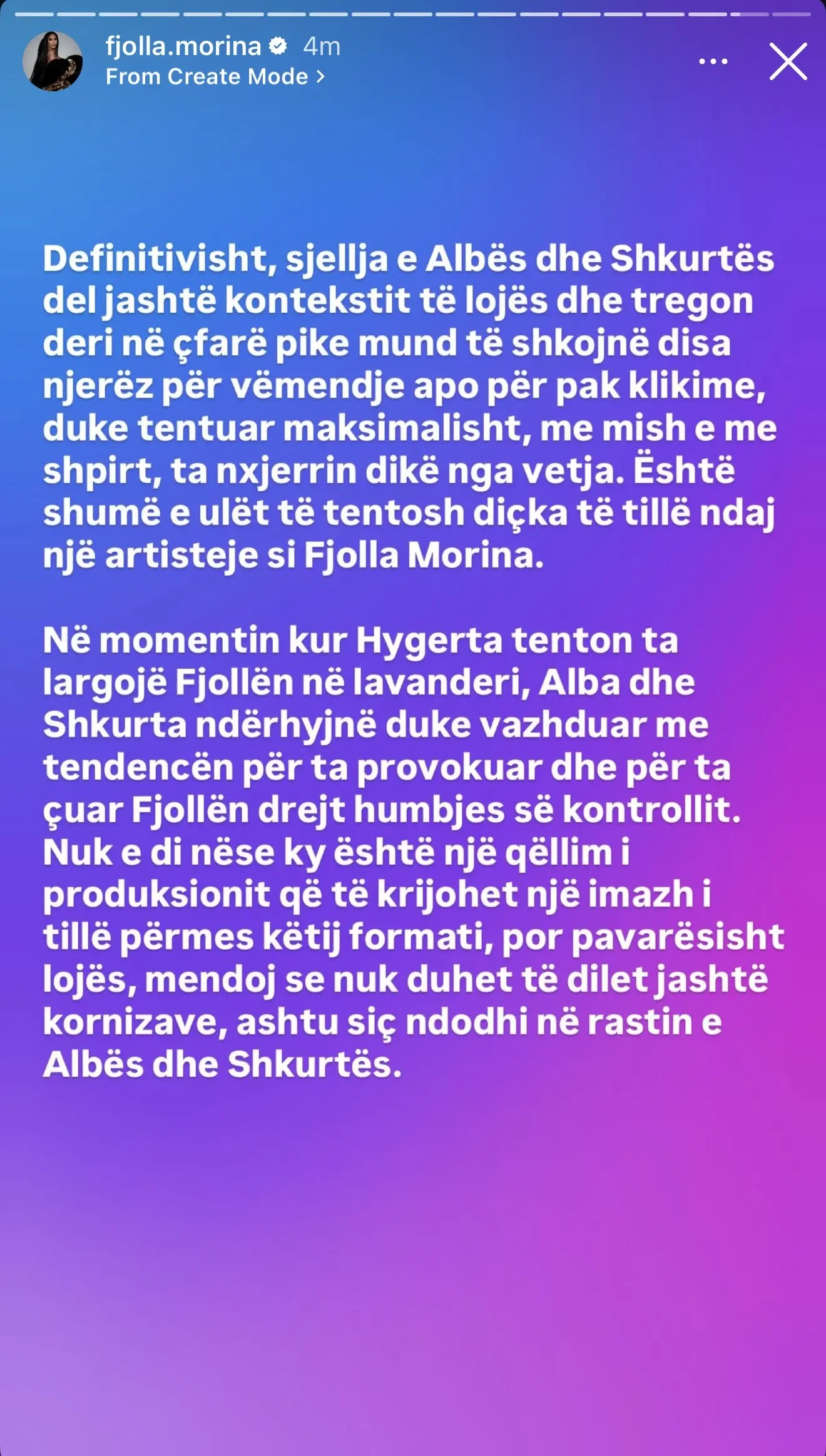 Lediana, vajza e këngëtares Fjolla Morina, ka thyer heshtjen përmes një postimi në rrjetin social Instagram, pas debateve të forta që nëna e saj pati me dy banoret e tjera, Albën dhe Shkurtën.
