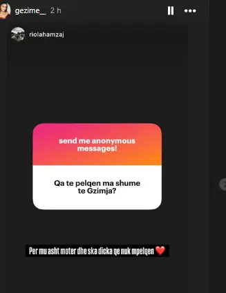 Në një intervistë të hapur për ndjekësit në Instagram, ajo shprehu ndjenja të thella për Gëzimen, duke e përshkruar atë si një person të dashur dhe të rëndësishëm në jetën e saj.