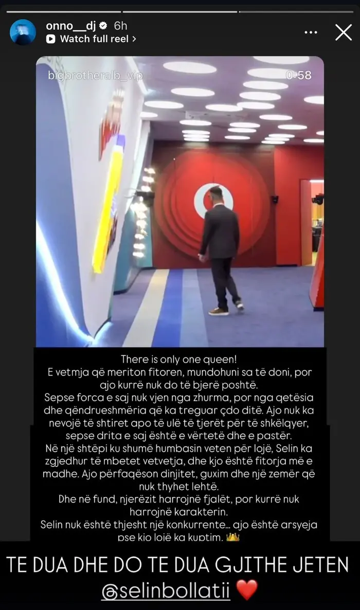 Vëllai i saj, Onno, reagoi menjëherë përmes një postimi të ndjerë në InstaStory, duke i dhënë Selin një mesazh mbështetjeje që ka prekur shumë ndjekësit e tij. Ai e cilësoi motrën e tij si “mbretëreshën e vetme” dhe fituesen e vërtetë të këtij formati, duke theksuar karakterin e saj të fortë.