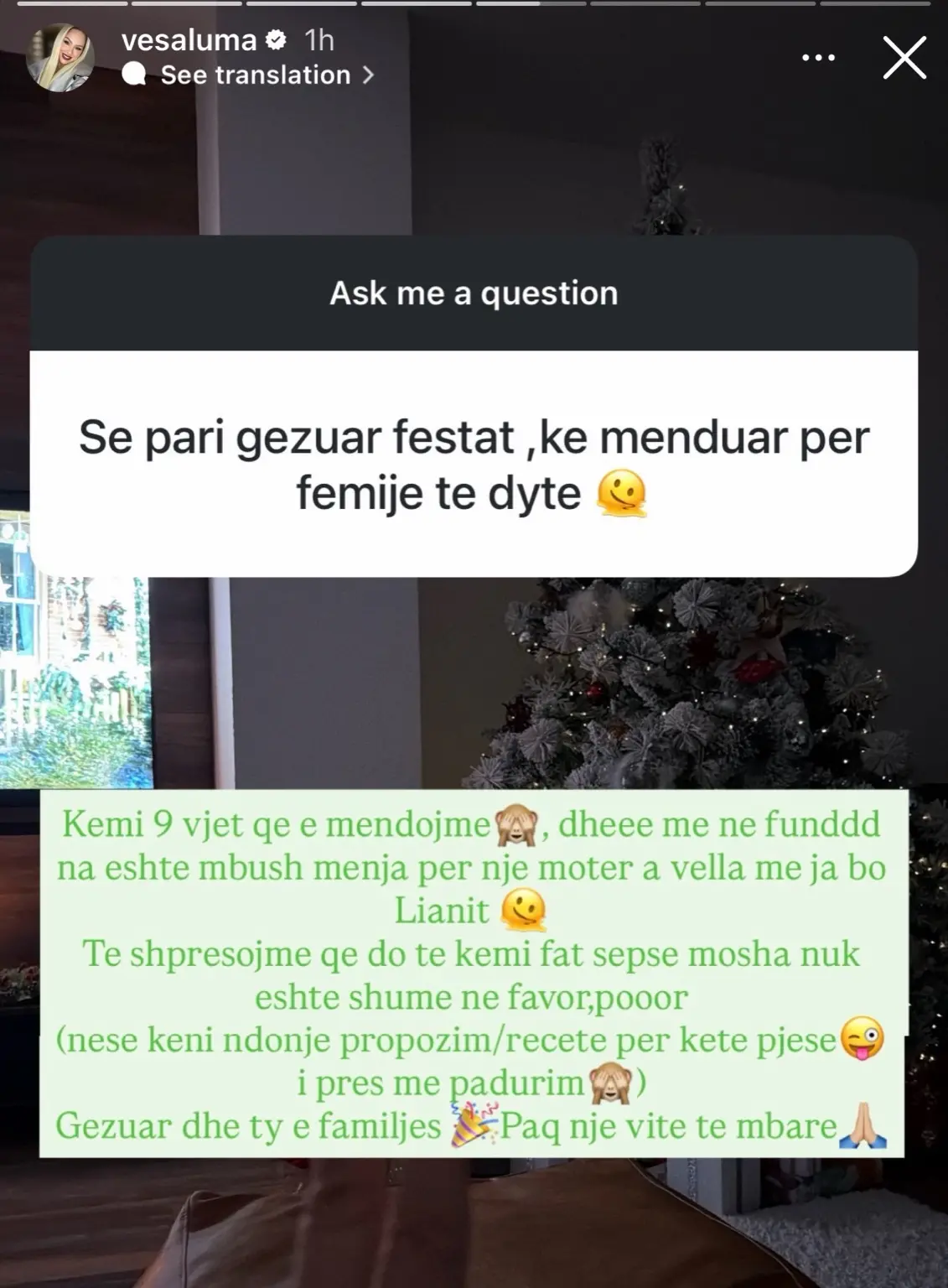 Vesa përfundoi mesazhin e saj me urime festive për ndjekësit, duke shkruar: “Gëzuar dhe ty e familjes. Paç një vit të mbarë.” Kjo tregon se ajo vlerëson lidhjen me fansat e saj dhe dëshiron të ndajë momente të rëndësishme me ta.