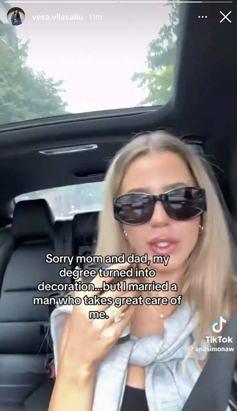 Një postim i saj në rrjetet sociale ka tërhequr vëmendjen e shumë njerëzve, ku ajo shkruan: “Më falni mami dhe babi, diploma ime u shndërrua në dekoratë… por u martova me një burrë që kujdeset shumë për mua.” Këto fjalë tregojnë përkushtimin e saj ndaj marrëdhënies.