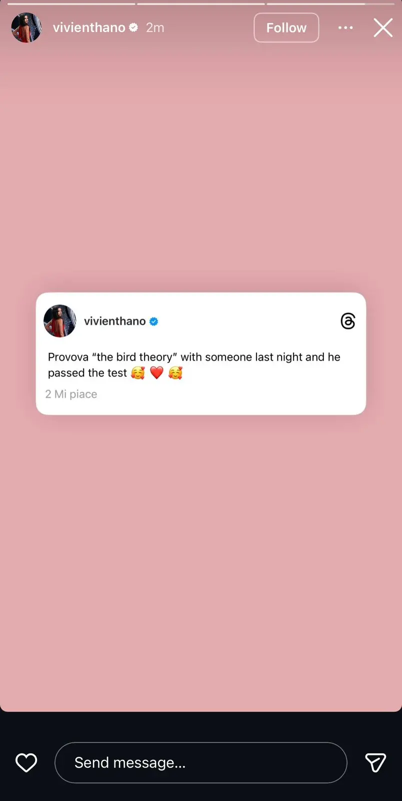 Vivien shkruan: “Provova ‘teorinë e zogut’ me dikë mbrëmë dhe ai e kaloi testin 🥰❤️🥰.” Kjo deklaratë ka shkaktuar një valë interesimi, duke lënë të kuptohet se ajo po eksploron mundësitë e reja në jetën e saj personale.
