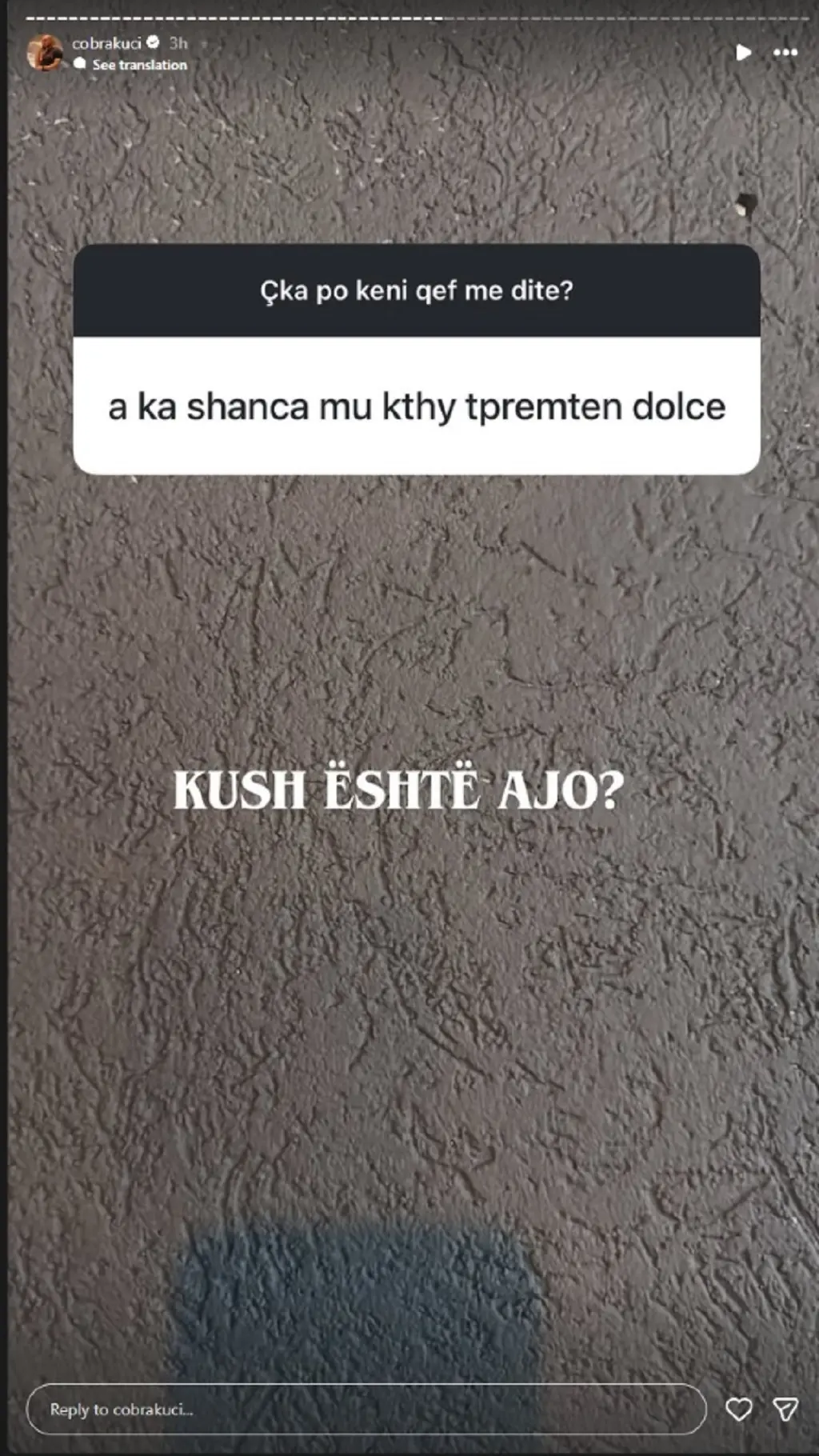 Në një pyetësor (Q&A) të zhvilluar sot në profilin cobrakuci, kur ndjekësit pyetën për një rikthim të mundshëm të Dolcës të premten, përgjigja ishte injoruese deri në ekstrem: “KUSH ËSHTË AJO?”.